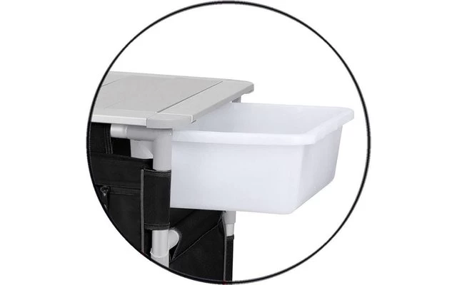 Die Außenhaut ist innen beschichtet. Besonders robuste, langlebige Konstruktion, die auch mehrmaligen Auf- und Abbau unbeschadet übersteht. Die Montage ist einfach und schnell. Die innenliegende Kunststoffspüle kann durch die Alurollplatte abgedeckt und seitlich herausgenommen werden. Mit höhenverstellbaren Füßen um Bodenunebenheiten ausgleichen zu können. Lieferung inklusive Windschutz und Tragetasche.