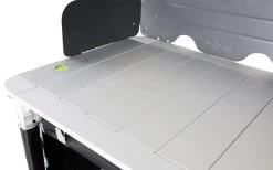 Der Bezug (100 % Polyester) ist sehr strapazierfähig. Die Ablagefächer können durch den integrierten Reißverschluss geöffnet werden, damit auch größere Gegenstände (z.B. die Gasflasche) verstaut werden können. Die Küchenbox hat eine rollbare Aluminium-Arbeitsplatte mit einer abwischbaren Folienbeschichtung unter der Arbeitsfläche.