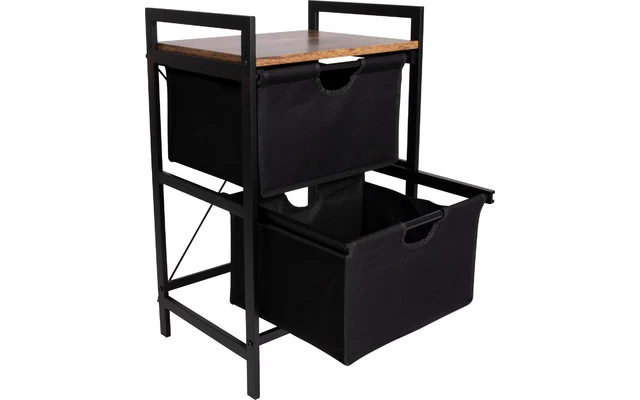 Ein stilvoller Schrank im Industrie-Look mit einer Platte in Holzoptik. Der Schrank ist mit zwei ausziehbaren Körben ausgestattet. Darüber hinaus hat der Schrank einen stabilen Stahlrahmen und eine 2-farbige 600D-Polyester-Verkleidung. Ideal für den Garten, zu Hause oder im Zelt. Zudem können Sie den Schrank komplett zerlegen und so kompakt verstauen.