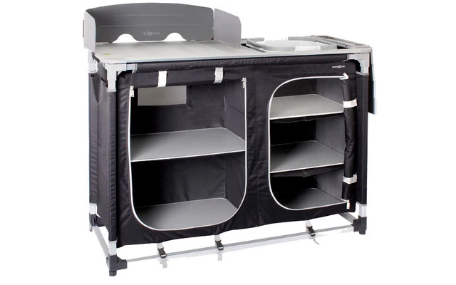 Praktische Campingküche mit integrierter, herausnehmbarer Faltspüle und 2 großen Staufächern mit viel Platz für Lebensmittel und Kochutensilien. Mit großer Alu-Rollplate und höhenverstellbaren Standbeinen. Äußerst stabile Ausführung dank Verwendung von verwindungssteifen Rechteckprofilen. Einfache, schnelle Montage. Arbeitshöhe: 90 cm. Die Lieferung umfasst einen Wind- und Spritzschutz, sowie eine praktische Packtasche.