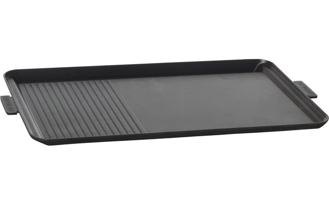 Zweiflammiger Gaskocher mit Aluguss-Grillplatte, integrierter Piezozündung und zwei Aluminium-Brennern. Gaszufuhr regelbar. Ohne Zündsicherung.