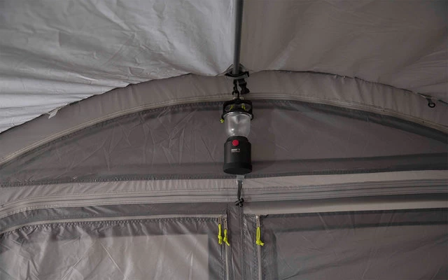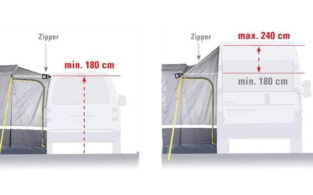 Eine Hochentlüftung belüftet das Zelt an regnerischen Tagen. Verschließbare, 50/50 teilbare Rückwand. Die gesamte Rückwand passt in die Easy Stow Away Tasche und es entfällt das lästige Aufrollen. Extra robuste Reißverschlüsse mit Regen-Abdeckung gegen Feuchtigkeit. 4 neongelbe, verstellbare Sturmbänder und Abspannleinen sind in der Dämmerung gut sichtbar. Kabeleingang mittels Reißverschluss und Kabelführung für Beleuchtung. Schleuse: Die Schleuse hat eine Dach-Befestigungslänge von 250 cm und eine verstellbare Anbauhöhe von 180-240 cm mittels Reißverschlusses und verstellbarem Gurtband. 2 Schleusentüren ermöglichen den Zugang zum Fahrzeug.