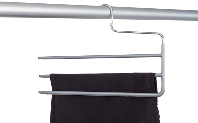 Bietet 3 Hosen auf geringstem Raum Platz. Hergestellt aus kräftigem, 5 mm starkem Stahldraht, verchromt. Der Bügel ist mit einem grauen Antirutsch-Belag beschichtet.